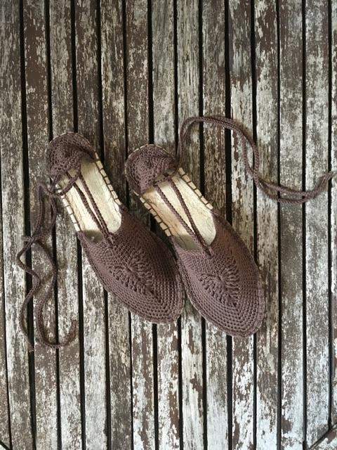 Espadryle wiązane kolor brąz. Wykonane na szydełku na podeszwach Prym z włóczki 96% bawełna, 4% stretch dzięki temu są wygodne, miękkie, rozciągliwe, przewiewne i zachowują kształt. Idealne na lato. Podeszwy wykonane ze 100% nietraktowanej, przyjaznej dla środowiska juty i ciągłego bieżnika wykonanego z powłoki gumowej. Buty ekologiczne, wegańskie, biodegradowalne. Kolor może nieznacznie odbiegać w rzeczywistości od pokazanego na zdjęciu, w zależności od ustawień Państwa monitora.